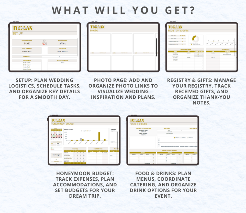 Inside, you’ll find customizable checklists, vendor trackers, guest lists, budgeting tools, timeline templates, and more—all in one easy-to-use digital file. Whether you're planning a large celebration or an intimate event, this planner is your ultimate wedding sidekick.